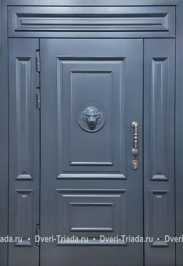 Входная группа с терморазрывом, декором «голова льва» и окрашенными панелями МДФ RAL серый Арт-450